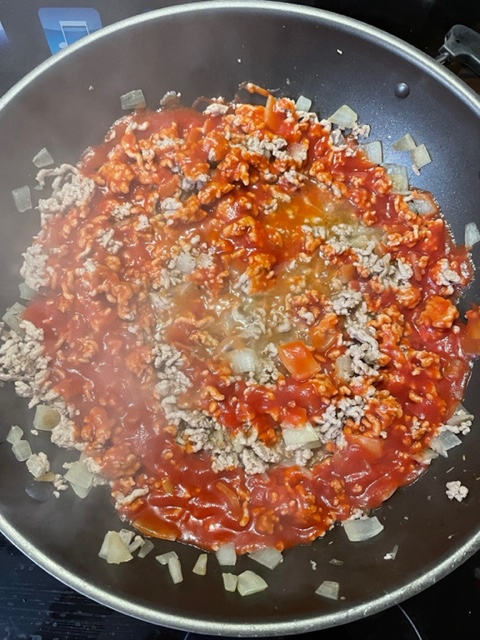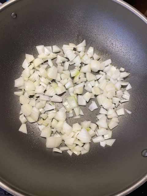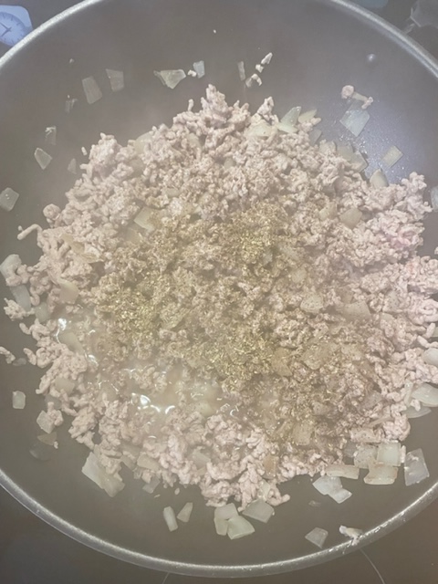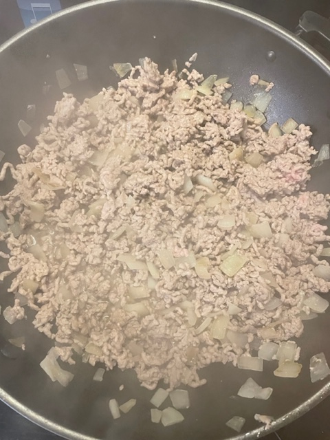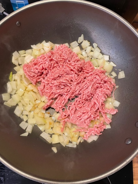 Zuerst fettet Ihr die Pfanne mit etwas Öl ein. Ich verwende hierzu einen Ölsprayer (https://amzn.to/3jKakeT). Die Zwiebeln würfelt Ihr in beliebiger Größe und bratet sie dann goldbraun an. Wenn sie goldbraun gebraten sind, gebt Ihr das Hackfleisch hinzu und bratet es mit.