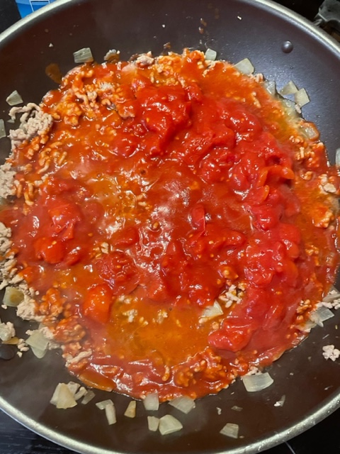 Wenn das Hackfleisch gut durchgebraten ist, würzt Ihr es mit Pfeffer und Oregano und fügt die passierten sowie die stückigen Tomaten hinzu.