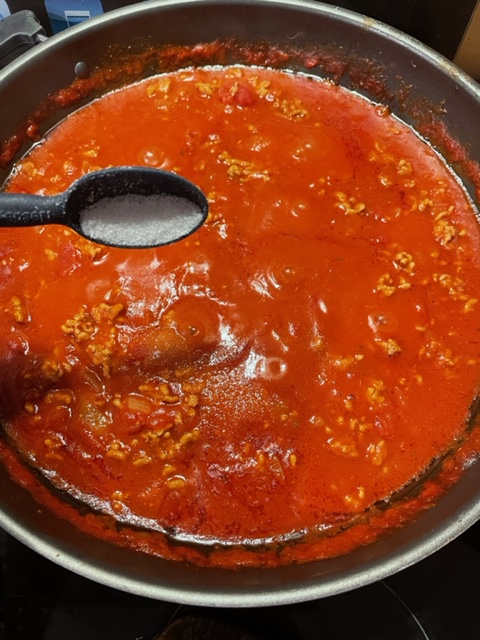 Wenn das Nudelwasser kocht, gebt Ihr die Spaghetti ins Wasser und kocht sie. Zu diesem Zeitpunkt könnt Ihr die Bolognese nun mit Zucker und Sahne verfeinern und abschmecken. Bei Bedarf kann natürlich auch noch mit Pfeffer oder Oregano nachgewürzt werden.