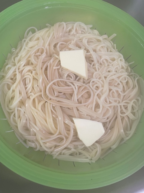 Wenn die Spaghetti die gewünschte Konsistenz haben, werden sie abgegossen und ihnen wird die Butter beigemengt.