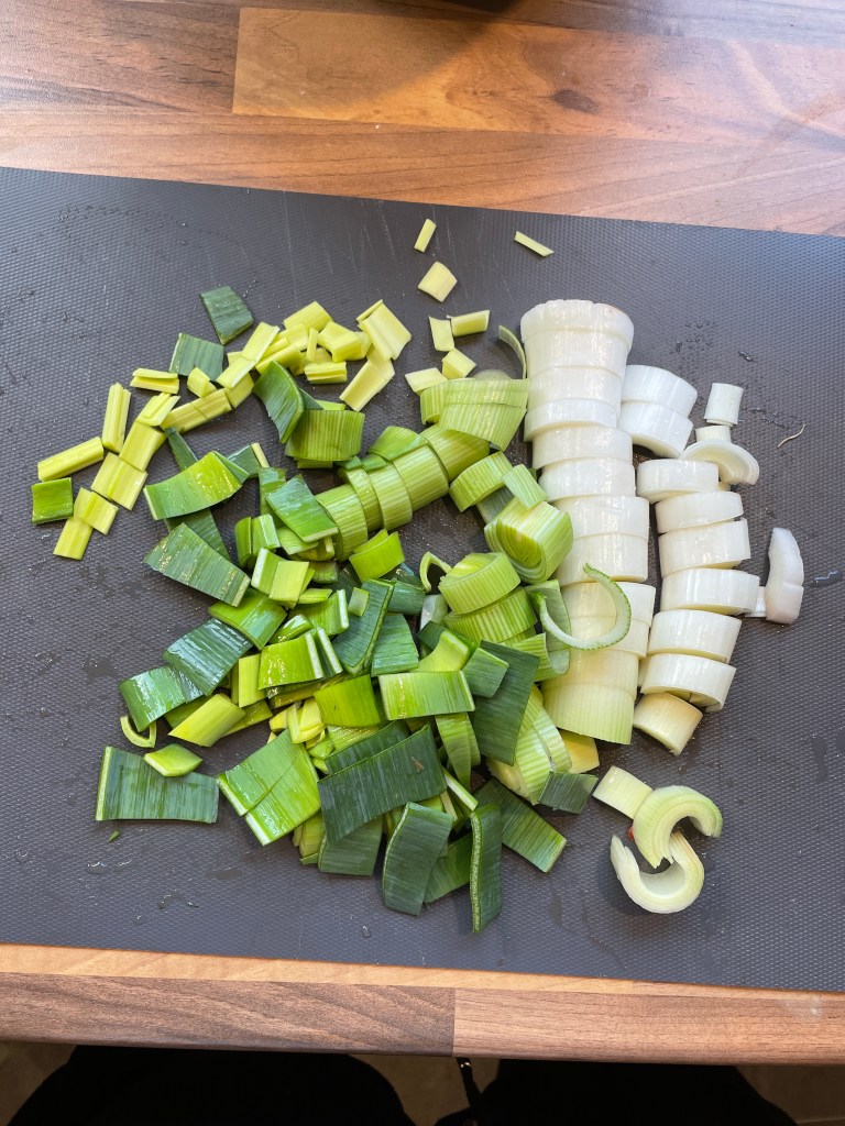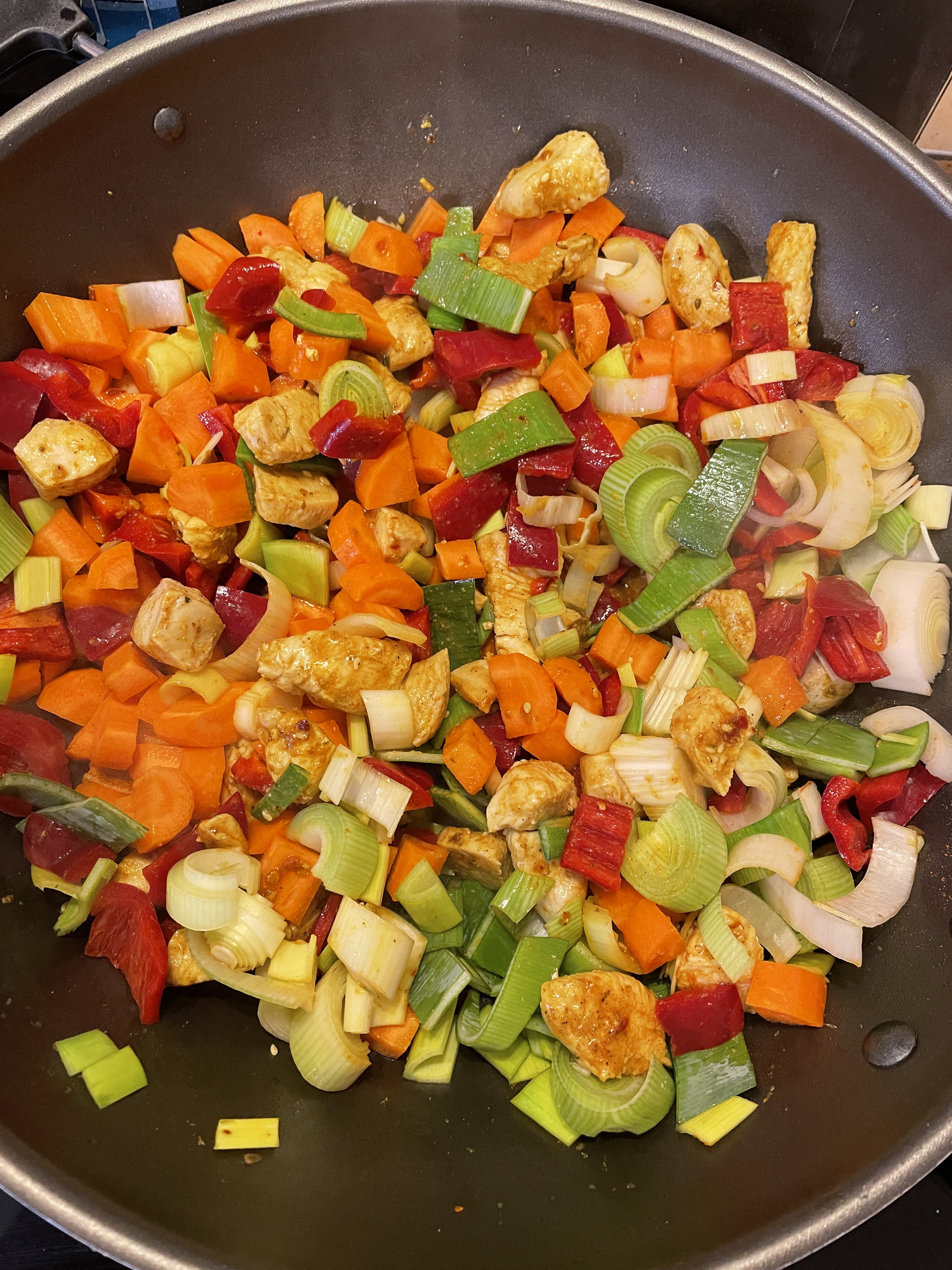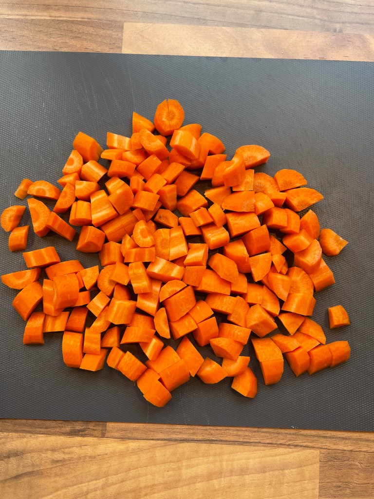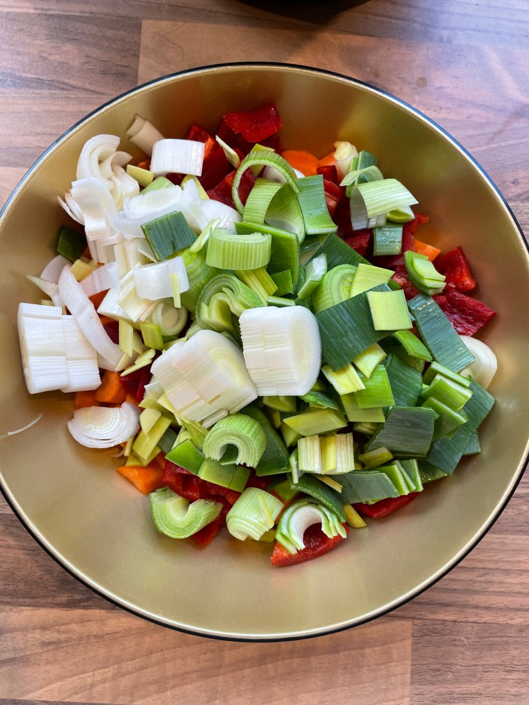 In der Zwischenzeit wird das Gemüse geschnitten. Hierbei kommt es ganz darauf an wie Ihr das Gemüse gern mögt. Lieber grob? Lieber ganz fein? Mehr Gemüse? Weniger? In einem Curry ist fast alles möglich. Für dieses Curry habe ich mich aber für Karotte, Paprika und Porree entschieden. Daher habe ich die Karotten geschält und halbiert – manchmal geviertelt – und klein geschnitten. Die Paprika habe ich gewaschen, entkernt und dann auf ca. die gleiche Größe gebracht wie die Karotten. Beim Porree war ich etwas grober und habe einfach halbe Ringe gemacht. Den Porree müsst Ihr einmal längst aufschneiden und die einzelnen „Schichten“ waschen, da sich dort oft Erdreste befinden.
