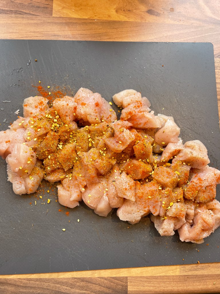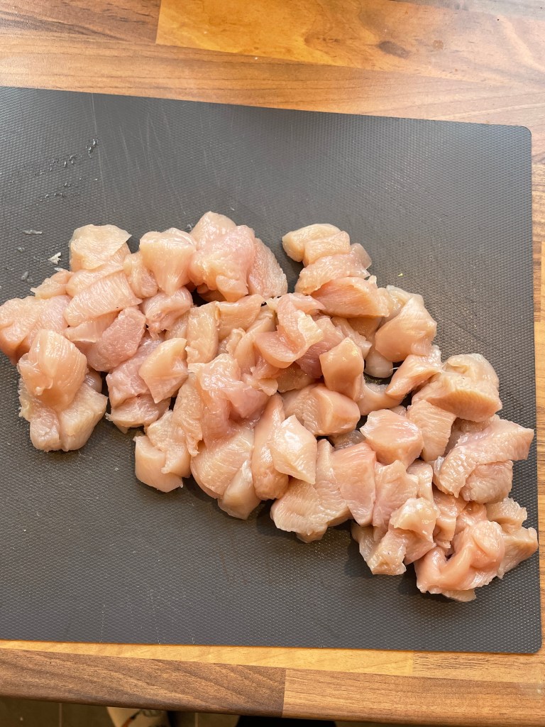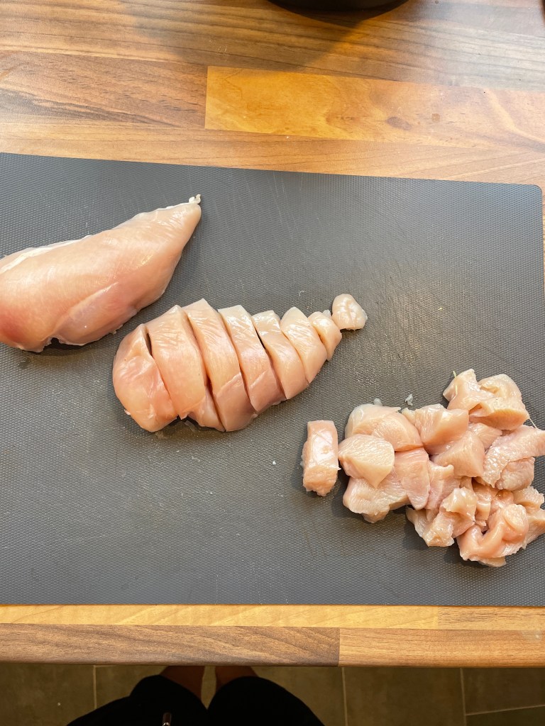 Die Hähnchenbrust wird gewaschen, mit einem Tuch trocken getupft und dann kleingeschnitten. Hierzu habe ich sie zuerst in Scheiben und dann in Stückchen geschnitten.