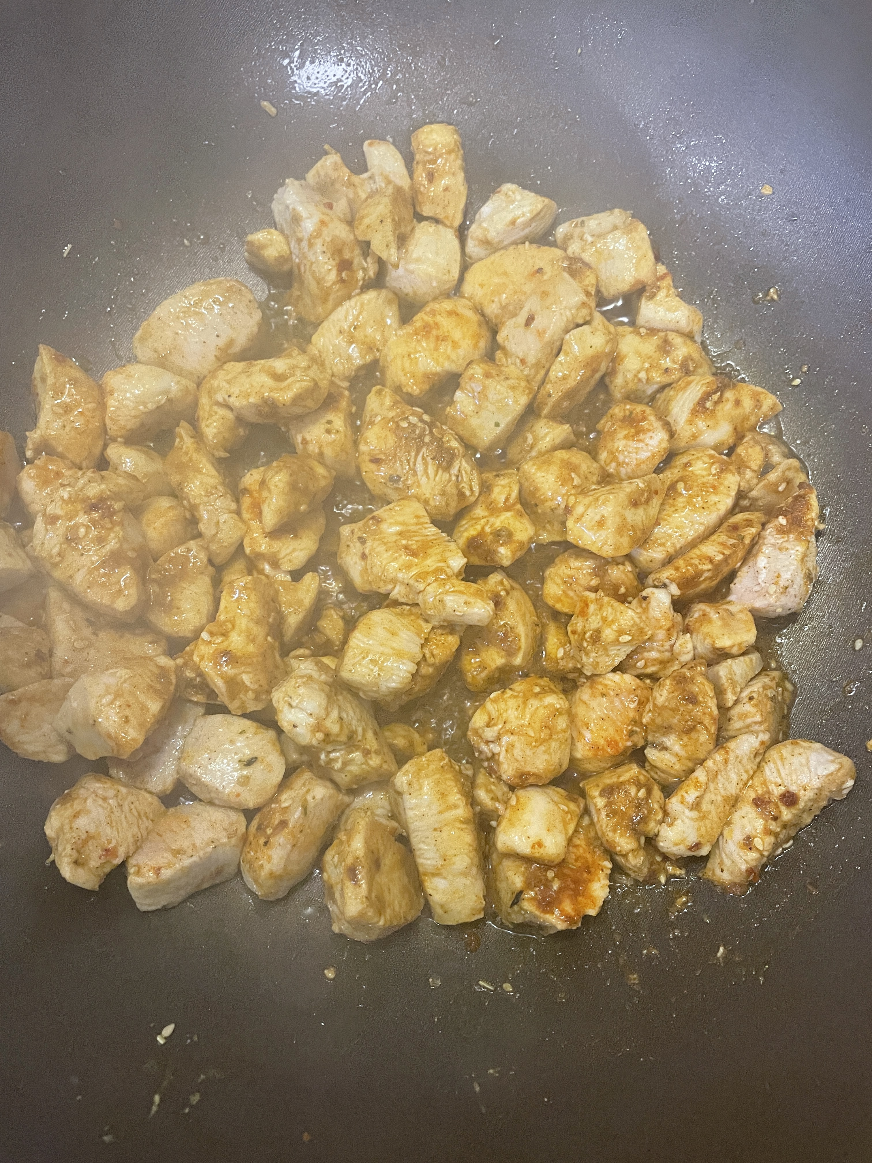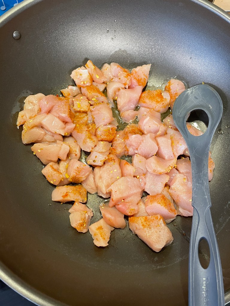 Als nächstes wird die Hähnchenbrust gewürzt. Ich würze grundsätzlich mit allen Gewürzen schon mal vor dem Braten vor und verfeinere dann später nochmal. So nimmt das Fleisch von Anfang an den Geschmack der Gewürze an, aber man kann die Intensität noch verändern. Das gewürzte Fleisch wird nun in Kokosöl in einem Wok (Wokpfanne) angebraten.